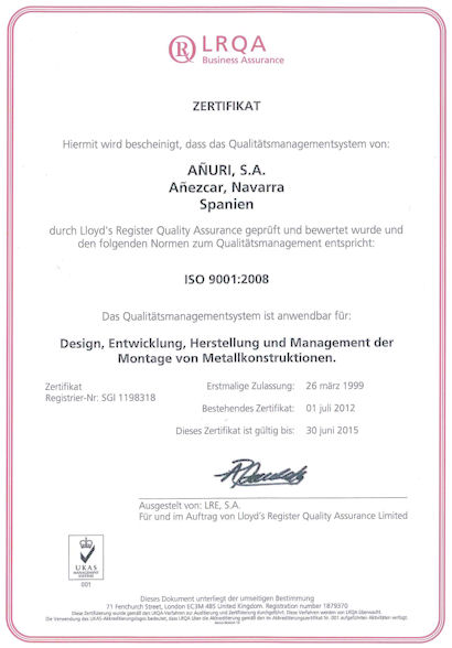 Wir waren das erste Metallbauunternehmen, das die ISO-Zertifizierung 9001:2000 – Lloyds Register Quality Assurance – andwendbar auf Design, Entwicklung, Herstellung und Montagebawicklung von Gebäuden aus Metallstrukturen erlangt hat. Dadurch sind die Qualität und ide Verpflichtung zu einer kontinuerlichen Verbesserung gewährleistet. Der Erhalt der Zertifizierung macht regelmäβige Überprüfungen alle sechs Monate und Protokolle zur kontinuierlichen Verbeserung der Prozesse und Produkte erforderlich. AÑURI erfüllt und übertrifft diese Anforderungen jedoch bei Weitem: